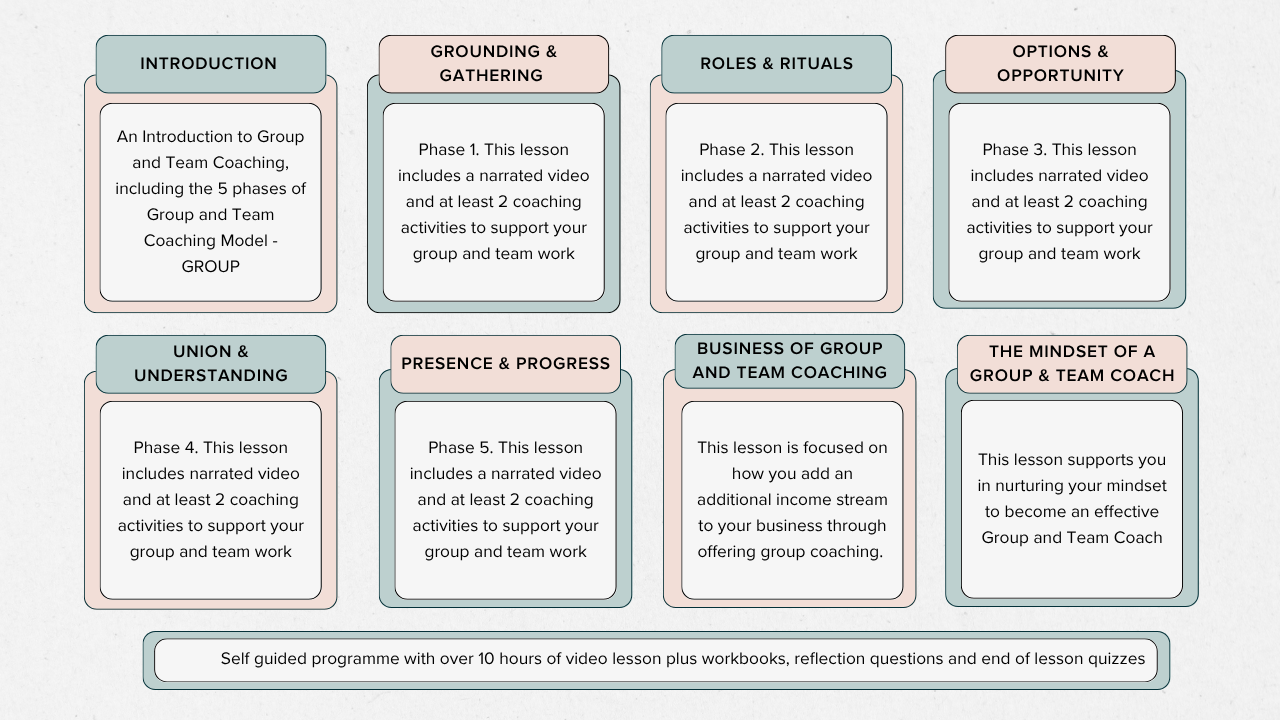 We'll take you through each of the 5 phases of group and team coaching starting with Grounding and Gathering, then Roles and Rituals, Options and Opportunities, Union and Understanding and finally Presence and Progress.